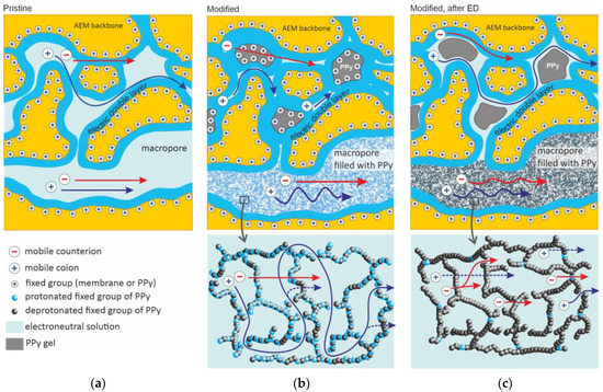 In order to improve the membrane properties, the idea of clogging the membrane’s non-selective macropores with a homogeneous microporous ion-exchange material was realized in some studies [24,35,37,38]. This idea is based on the fact that relatively large (macro)pores are the pathway for coions through the membrane [35,39,40]. The realization of this approach leaded to a 2.5-time decrease in the coion transport number in an anion-exchange membrane (CJMA-7, Hefei Chemjoy Polymer Materials Co., Ltd., Hefei, China) after its modification with the sulfonated fluoropolymer MF-4SK (JSC “Plastpolymer”, Saint Petersburg, Russia) [35]. The polypyrrole (PPy)-based modification of an FAA-3-50 membrane (Fumatech BWT Company, Bietigheim-Bissingen, Germany) resulted in a twofold increase in membrane conductivity [38].