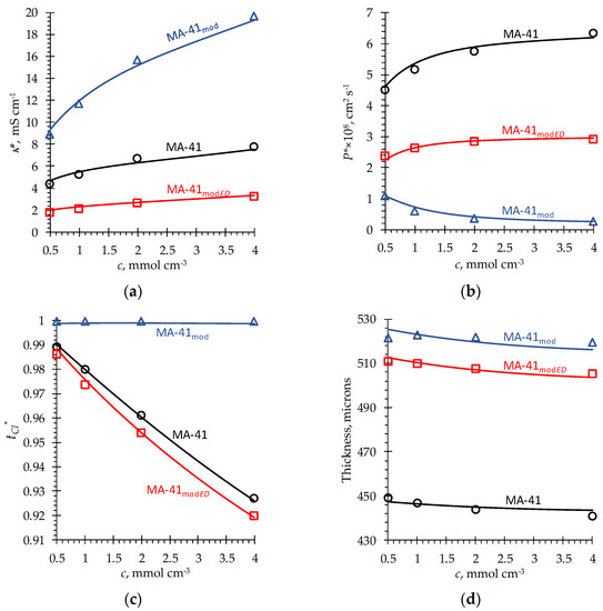 As can be seen from Figure 6, the choice of input parameters (Table 1) described in the previous Section makes it possible to obtain a quantitative agreement between the experimental and simulation results for the MA-41, MA-41mod and MA-41modED. A good agreement is obtained at once for electric conductivity, diffusion permeability, transport numbers of Cl− ions and membrane thickness as functions of the concentration of bathing solution.