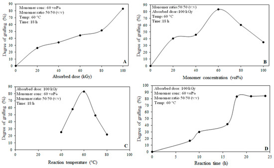 Variation of degree of grafting with reaction parameters: (A) absorbed dose, (B) monomer concentration, (C) reaction temperature, and (D) reaction time.