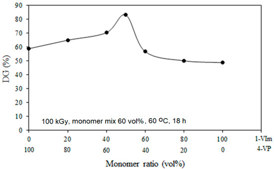 Figure 2 displays the variation of DG with the comonomer ratio for grafting of 4-VP/1-VIm mixtures onto ETFE films in the range of 20–80%. Pure individual monomers (100% 4-VP corresponding to 0% 1-VIm and vice versa) were used as references. It can be clearly seen that DG increased with the increase in the content of 1-VIm in the comonomer mixture that accompanied the decrease in 4-VP content reaching the highest value of 83% at a 4-VP/1-VIm composition of 50/50 vol%. This DG value is higher than the maximum amount of DG that could be obtained with grafting of individual monomers (4-VP or 1-VIm). When a binary monomer mixture is grafted, the molecules of the most reactive one diffuse faster inside the swollen film and subsequently carry the least reactive monomer molecules present in the solution. Therefore, the overall monomer concentration in the grafting zone increases leading to a complementary situation for higher graft copolymer formulation. Therefore, a synergistic effect in the grafting process of 4-VP/1-VIm binary mixture onto ETFE film took place. This trend goes along with the observation reported in the literature for RIG of acrylonitrile and acrylic acid binary mixture onto PE film [46]. However, the increase in the concentration of 1-VIm was observed to cause a decrease in DG. This could be due to the increase in the viscosity of the monomer mixture that hinders the propagation reaction [47] and/or steric hindrance caused by the presence of basic pyridine and imidazole rings in the grafting zone [35,48].