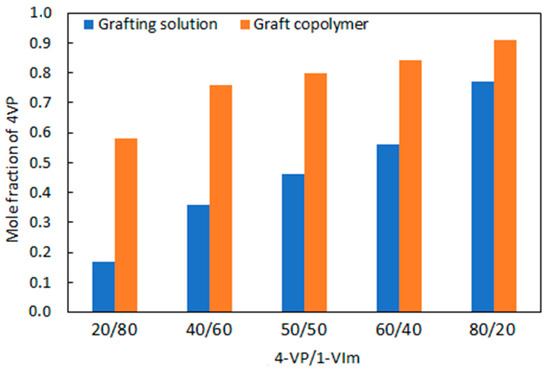 Variation of mole fraction of 4-VP in grafting mixture (blue) and in graft copolymer (orange). Grafting parameters: monomer conc. of 60 vol%, absorbed dose of 100 kGy, reaction time of 18 h, and temperature of 60 °C.