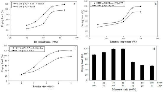 The increase in the doping temperature enhanced the rate of reaction and led to a gradual rise in DL when the temperature increased from 30 to 70 °C and continued to increase, but with a slower pace to 80 °C as shown in Figure 5b. The membrane grafted with a comonomer system (4-VP/1-VIm) showed a higher DL than the ETFE film grafted with 4-VP alone, confirming the enhancement of basic characters imparted by grafting this binary mixture.