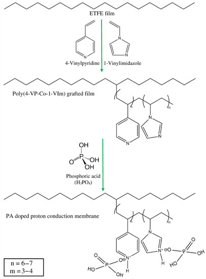 Various preparation methods have been used for the development taking place in such proton conducting membranes. Of all, RIG is an appealing method that is well-known for covalently imparting side chain grafts originated from parent polar monomers to preformed polymer films. This technique provides a compelling way to prepare ionic membranes by integrating many vinyl monomers with polymeric sheets/films as starting substrates to acquire functional groups imparting desired properties. Thus, RIG has been widely utilized to prepare a variety of polymer electrolyte membranes for various types of electrochemical storage including vanadium redox flow batteries and electrochemical conversion devices, such as PEMFC [22,23,24,25,26,27,28]. Of particular interest, PCMs for HT-PEMFC were pursued several years ago, and few alternative acid/base membranes were prepared by RIG of 4-vinylpyridine (4-VP) or 1-vinylimdazole (1-VIm) onto partially fluorinated polymers such as poly(vinylidene fluoride) (PVDF) and poly(ethylene-co-tetrafluoroethylene) (ETFE) films followed by PA acid doping under controlled conditions. These membranes, which have H-bonds network of pyridine or/and imidazole rings and phosphoric acid gives sites enhancing proton hopping and reducing acid leaching showed a potential to replace PBI/PA membranes [29,30,31]. Such membranes were reported to have relatively low conductivity (9.6 mS/cm) and to be prone to acid leaching, lowering their conductivity when used in HT-PEMFC [32].