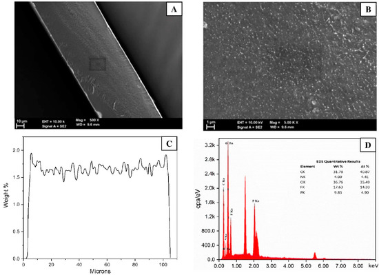 Cross-sectional view of ETFE-g-P(4-VP/1-VIm)/PA membrane with: (A) low magnification, (B) high magnification and (C) phosphorus mapping across membrane together with (D) EDX image of membrane elemental composition.