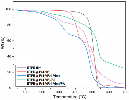 TGA thermograms of pristine ETFE film, ETFE-g-P(4-VP), and ETFE-g-P(4-VP/1-VIm) films compared to ETFE-g-P(4-VP)/PA and ETFE-g-P(4-VP/1-VIm)/PA membranes.