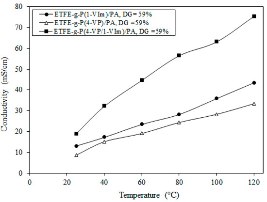 Figure 12 shows the variation of proton conductivity with temperature for ETFE-g-P(4-VP/1-VIm)/PA compared to their corresponding PA-doped membranes, obtained from the grafting of individual 4-VP and 1-VIm monomers onto ETFE films and having the same DG (i.e., 59%). The proton conductivity was found to increase with the rise in temperature in all membranes while maintaining superior values in ETFE-g-P(4-VP/1-VIm)/PA compared to other membranes. For instance, the highest proton conductivity reached 75.4 mS/cm for ETFE-g-P(4-VP/1-VIm)/PA compared to 43.5 mS/cm for ETFE-g-P(1-VIm)/PA, and 33.4 mS/cm for ETFE-g-P(4-VP)/PA membranes. Since the proton conductivity of PA-doped membranes is known to take place by the alternate cycle of formation and dissociation of H-bonds network causing proton hopping [54], the proton conductivity rise in all membranes can be attributed to the enhancement of protons mobility (Brownian motion) and reduction in charge transfer resistance [55]. The superior proton conductivity values in ETFE-g-P(4-VP/1-VIm)/PA membrane are due to the increase in the number of proton nitrogen receptor sites originating from the incorporated pyridine and imidazole rings, which increased both acid DL and proton conductivity in turn. These results confirm that the grafting of 4-VP/1-VIm binary monomer mixture onto ETFE is more advantageous than grafting of individual monomers in imparting more basic characters to the copolymer films in forming more proton acceptor sites, allowing greater H-bonds network for proton mobility.