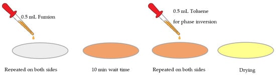 The composite anionic membrane reported here was prepared using a microporous monolayer membrane made of polypropylene with 41% porosity and 25 µm thickness, with surfactant-coated Celgard 3401 (Celgard®, Charlotte, CA, USA) to improve its hydrophilicity as the backbone, and was activated with Fumion FAA-3 solution in NMP 10% (Fumatech, Bietigheim-Bissingen, Germany). Activation was undertaken to ensure ion-exchange capacity and hydroxide conductivity for AEM applications. We carried out the activation on small pieces of porous Celgard (4 cm × 4 cm). Our application relies on phase inversion, which involves the polymer transforming from the liquid phase of the solution into the solid phase. The concept of the phase-inversion process has been explained elsewhere []. Phase inversion can be induced with different techniques, such as immersion precipitation, precipitation by controlled evaporation, thermal precipitation, or vapor-phase precipitation. The choice of method of phase inversion is highly dependent on the type of polymer and the solvent used to dissolve the polymer. As the first approach, we decided to use immersion precipitation by customizing it into a manual batch mode, applying a certain amount of ionomer solution and inversion solution. For each piece of the sample, we dropped 0.5 mL of Fumion FAA-3 solution on the membrane surface until it became transparent, and then we did the same on the other side of the membrane. After 10 min, we dropped 0.5 mL of toluene—as a non-solvent to induce inversion—on the Celgard surface. After 10 min, we repeated the operation on the other side of the membrane. Then we let it dry at room temperature overnight under the hood (Figure 1).