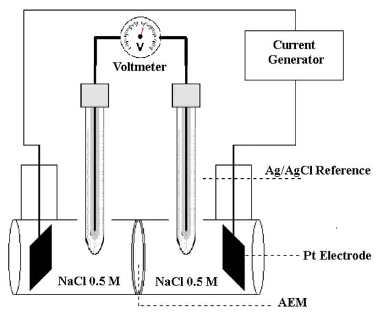 The membrane conductivity can be obtained from the measurement of the resistivity of the membrane against the flow of current using a four-point probe electrochemical cell (Figure 2). The method is explained elsewhere []. Briefly, the cell is composed of two compartments that can house membranes with a diameter of 3.5 cm with an area exposed to the solution equal to 7.07 cm2. The ionic conductivity of the membrane was determined with at least three successive measurements of the potential difference between the reference electrodes. A linear voltage sweep was applied in short time intervals (5 s), voltage vs. current was plotted, and the slope gives us the resistance (Ω) without the membrane and with the membrane between the two compartments. For this experiment, the NaCl solution in the cell was maintained at 0.5 M. Without the membrane, the measured resistance of the aqueous NaCl solution between the two reference electrodes is Rcell; with a membrane, the total resistance is the sum of the resistance of the cell and that of the membrane: Knowing the cell resistance (Rcell), the value of the membrane resistance is defined as the difference between these two resistances: . The ionic conductivity, σ (S cm−1), of the membrane can be determined using the following relationship: