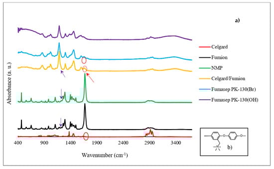 The FTIR analysis confirms the success of the Celgard activation with the ionomer solution by applying the proposed procedure. FTIR spectra of the Celgard samples before and after the Fumion activation are reported in Figure 4. Fumion (ionomer solution in NMP solvent) and NMP are also reported for clarity. Fumasep PK-130, in the Br− and OH− form, is used as a reference. Chemically, the Fumion ionomer is a polyaromatic polymer with ether bonds in the main chain and quaternary ammonium groups attached to the main chain (Figure 4b). The spectrum of the membrane after the ionomer activation (Celgard/Fumion) shows the presence of some peaks due to the ionomer. In particular, it is possible to observe the infrared absorption at 1671 cm−1, due to the =CH2 bending vibration from the aromatic rings, and at 1602 cm−1, attributable to the stretching vibration of the N-C groups from the quaternary ammonium groups. In addition, the peak at 1187 cm−1 is detected in both the Celgard/Fumion (intense peak) and Fumion spectra (weak peak). This infrared absorption is not present in the NMP spectrum. This evidence suggests that the peak is probably due to the polymer dissolved in the ionomer solution. It is worth noting that the FTIR spectrum of Celgard activated with Fumion is comparable to that of the commercial membrane Fumasep, selected as the reference.
