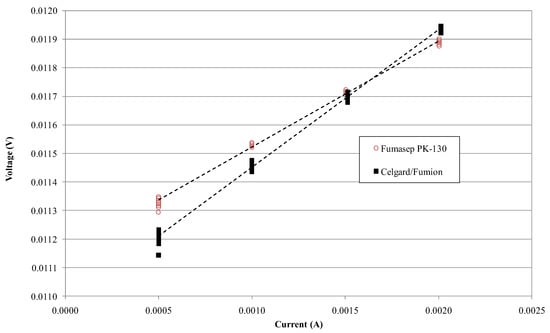 Figure 6 shows the voltage–current measurement on Fumasep-PK-130 and Celgard/Fumion membranes. The slope is greater for Fumasep, indicating a higher resistance due to its thickness. Table 2 shows the calculated conductivity for both membranes using Equation (2), obtained by measuring Kcell and Rcell in a NaCl 0.5 M solution at 25 °C (respectively, Kcell = 369.39 cm−1, Rcell = 0.038 Ω). The conductivity of the commercial Fumasep is within the ranges provided by the producer in the datasheet for the Cl− form (4–8 mS cm−1). Table 2 also reports IEC defined using titration for the samples. Despite the composite membrane having lower conductivity and IEC than the commercial one, the ASR is lower due to its minor thickness. This result represents a good compromise where poor ion conductivity could be compensated for with a low area-specific resistance (ASR).