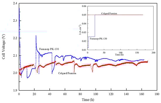 Measurement of cell voltage vs. time for Celgard/Fumion and Fumasep-PK-130 membranes at 25 °C. The inset figure shows the current density profile during the experiment.