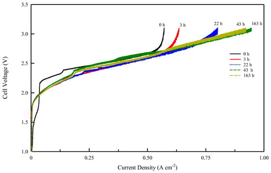 Cell voltage vs. current density profile for Celgard/Fumion membrane after different electrolysis times at 25 °C.