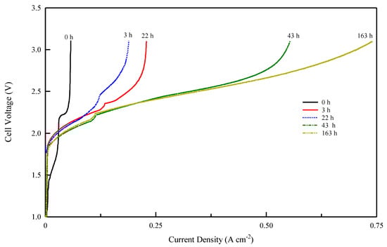 These studies show that to verify the performance of an anionic membrane, it is necessary to achieve a prolonged pre-treatment phase of electrolysis with a gradual increase in current to eliminate CO2. In our study, both membranes showed the same carbonation effect in electrolysis (Figure 7). Figure 8 and Figure 9 show the voltage vs. current density after the different electrolysis times shown in Figure 7. The electrolysis at constant current density was stopped after various time intervals and a Galvano-dynamic experiment was performed at 1 mAs−1. Initially, the electrolyzer’s current density is constrained by the conductivity drop due to the accumulation of carbonate and bicarbonate ions, which inhibit the transport of OH− ions. Following Figure 8 and Figure 9, both systems reached a higher maximum current density as electrolysis proceeded but with different values. A minimum amount of current and gas evolution (reactions 6 and 7) allows the elimination of carbonate ions and the recovery of the OH− conductivity resulting in an increase in the electrolysis current. However, the maximum current density achievable by the system progressively increases with the working hours of the electrolysis test. The same behavior of current limitation due to the CO2 effect was studied in detail by Ziv et al. in anion exchange membrane fuel cells (AEMFCs) and is well illustrated in references [,]