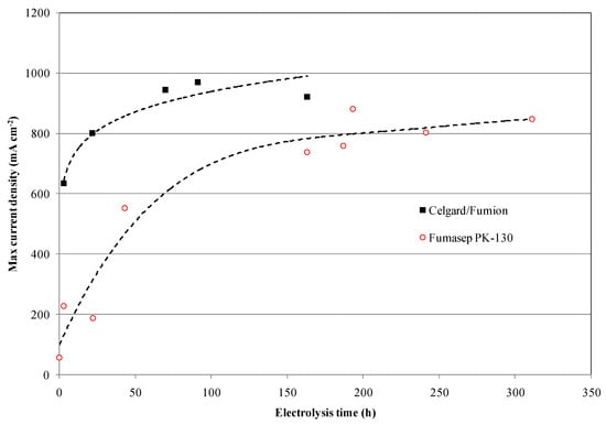 Continuing the measurements, the commercial Fumasep membrane did not reach the same performance as the Celgard/Fumion, even after the electrolysis test was prolonged up to 310 h (Figure 10 and Figure 11).