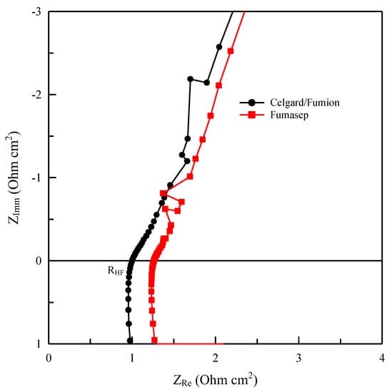 Nyquist plot for cell with Fumasep and Celgard/Fumion membranes at 25 °C and OCP (in electrochemical impedance spectroscopy—EIS).