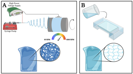 Preparation of poly(vinyl-alcohol) electrospun membranes (A) and bulk hydrogels (B).