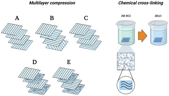 After removing the membranes from the collector (Supplementary Figure S1), 10 × 10 cm squares were cut. Four layers with different orientations were placed onto each other. Five different arrangements were designed, as Figure 2 illustrates. Subsequently, the multilayer samples were compressed with 5 tons along their entire surface by a manual hydraulic press. Samples were then immersed in 2 M HCl solution to catalyze the cross-linking reaction. After the samples turned opaque, they were extensively washed in ultrapure water until a neutral pH was reached in the supernatant (Figure 2—Chemical cross-linking).