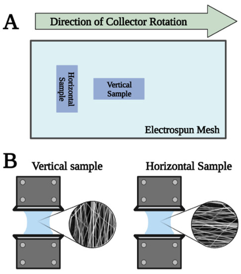 For the assessment of the specific loading capacity, we utilised a 5942 uniaxial tester (Instron, Norwood, MA, USA). Rectangles measuring 2 × 6 cm sized were cut out from the electrospun meshes labeled as vertical and horizontal according to the direction of fibre orientation (Figure 3). Samples were placed between the clamps of the mechanical tester and were pulled at 1 mm/min speed until tearing. In addition to their small thickness, electropsun meshes are considered soft materials. Thus, mechanical performance was evalutated by calculating specific loading capacity considering the samples’ surface density.