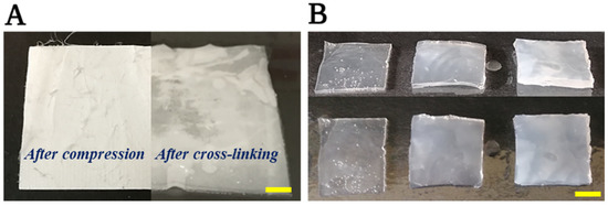 Electrospun PVA membrane (A) before (left) and after (right) chemical treatment, Hydrogels (B) prepared by (low-temperature crystallisation method (left), freezing-and-thawing method (middle), hot-pressing method (right). Note: Scale bar at 0.5 cm.
