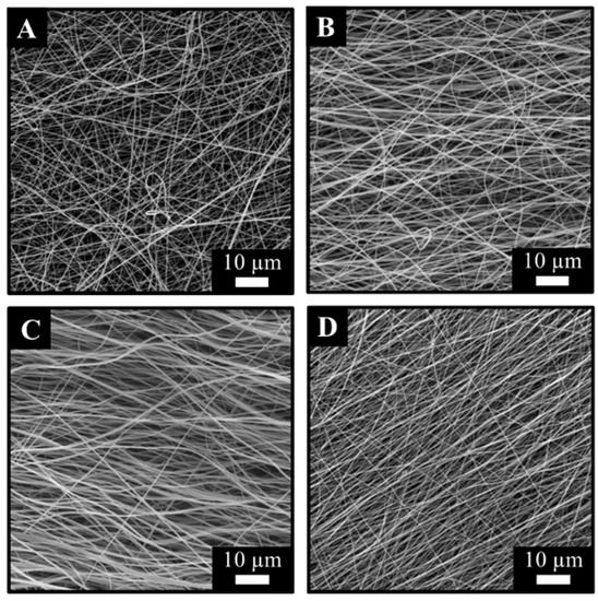 Scanning electron microscopy of electrospun membranes fabricated at (A) 500 rpm, (B) 2000 rpm, (C) 4000 rpm, and (D) 6000 rpm collector speeds.