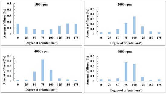 All membranes were successfully fabricated without fibre aberrations such as beads, bubbles, or other artifacts. At 500 rpm, the fibres orient equally in each direction, looking remarkably similar to the meshes produced on the static immobile collector (Supplementary Figure S2) with no apparent difference in alignment. With higher collector speeds, however, the alignment increases (Figure 7 and Figure 8). At 2000 rpm, approximately 80% of the fibres are aligned within a 50-degree range (Figure 8). This slightly increases with the 4000 rpm samples (Figure 8). The 6000 rpm membranes are the most oriented, where most of the fibres (approximately 80%) are found within a 25-degree range (Figure 8). Evidently, increasing the collector speed leads to greater fibre orientation, albeit non-aligned fibres will always be present to some degree.