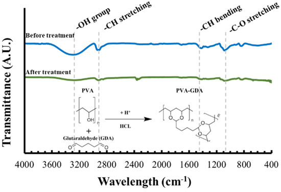 Chemical cross-linking starts directly after glutaraldehyde (GDA) is added to the polymer solution before electrospinning; nevertheless, its full effect only takes place only after the samples are immersed in an acidic solution (in this case, 2 M HCl). Normally, as PVA is water-soluble, non-treated PVA meshes would dissolve in water, but since the chemically treated samples persisted under the storage for more than a month, with no physically visible structural changes or material loss, we could assume the completion of cross-links was successful. This was further confirmed by the ATR-FTIR spectroscopy measurements (Figure 9). More specifically, examining PVA membranes spectra, the -OH peak at 3303 cm−1 decreases after the chemical treatment as the GDA cross-linking is successful.