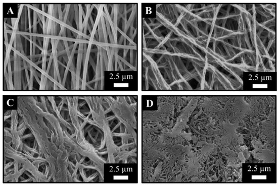 Scanning electron microscopy of hydrogel fibre membranes before (A) and after chemical treatment with 25 (B), 12.5 (C), and 6.25 (D) cross-linking degrees.