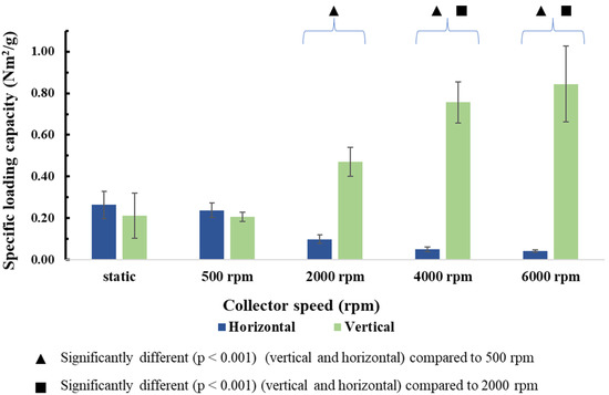 Representative stress–strain curves of these membranes (Supplementary Figure S3) resemble typical electrospun system curves found abundantly in the relevant literature [16,40]. At 500 rpm, mechanical performance was not significantly different from samples produced with the static immobile collector. However, as alignment increases at 2000 rpm and above, so does the specific loading capacity (Figure 11). In contrast, performance on a 90° degree angle (horizontal samples) decreases. Similar findings were documented by other electrospinning works as well [47].