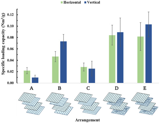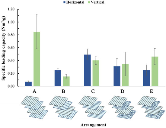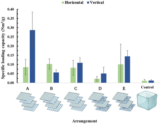 - The samples exhibited a decrease in specific loading capacity in the vertical direction and an increase in the horizontal one. The concept of this arrangement was that force would be equally exerted from all directions; however, to the nature of the measurement (cutting vertical and horizontal samples), this effect is overshadowed. Utilising a bi-axial mechanical tester would provide further insight; however, such equipment was not available.