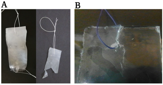 Suturability of poly(vinyl alcohol) electrospun membranes before and after uniaxial measurement (A) and bulk hydrogels (B).