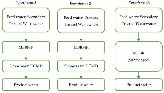 Three experiments were carried out in this study. The first and second experiments were devoted to evaluating the performance of a hybrid moving bed biofilm reactor (MBBR) combined with a UF membrane followed by a DCMD system for the treatment of primary and secondary wastewater, respectively. In the third experiment, the performance of the submerged MDBR system was assessed for the purification of secondary treated wastewater (Figure 1).