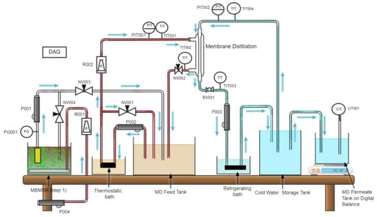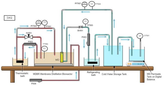 Polyurethane (PU) tubes were used to connect all tanks. A refrigerated bath has been used (Huber, model no MPC-K25, Germany) for cooling the MD permeate. Diaphragm pumps were used to transfer the influent from one tank to another. An air pump was used to maintain sufficient dissolved oxygen (DO) levels in the reactor. The transmembrane pressure of MBR was measured by using a pressure gauge. Needle valves were used at specific points to control the flow in the model reactor. A pressure transducer for the hot side membrane inlet is provided; similarly, a pressure transducer for the cold side membrane inlet is provided. Thermocouples measure the temperature at the hot side of the membrane (both inlet and outlet) as well as for the cold side (both inlet and outlet). A ball valve has been provided for flow control. A conductivity transmitter (Signet 9900 Transmitter) was provided to record the conductivity of treated water. A precision scale (GF-1200 precision scale from AandD Weighing) was used to measure the final treated water from the MD. All fittings and valves were made of stainless steel 316 L fittings. Finally, a data acquisition system (DAQ) was used to record the pressure, temperature, and mass of permeate on a timely basis.