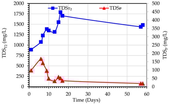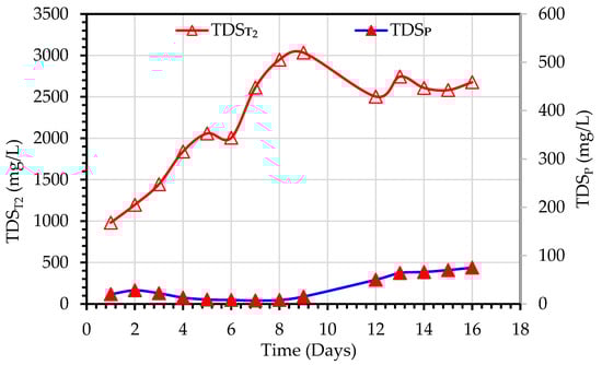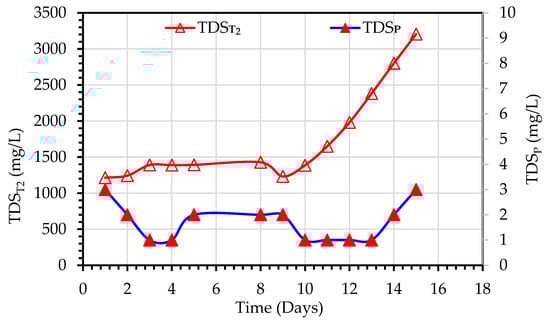 Figure 11 shows the variations of TDST2 and TDSP observed during the purification of secondary wastewater using the MDBR system (Experiment 3). TDST2 values ranged from 890–1914 mg/L, and TDSP values were in the range of 19–167 mg/L. This increase in TDST2 is due to the rejection of the dissolved ions by the MD module which results in the accumulation of dissolved ions in the bioreactor tank. It should be noted that at Day 17 when the TDST2 concentration reached 1705 mg/L, the MDBR tank was emptied and refilled again with feed secondary treated wastewater. In contradiction to the observed trend of correlation between TDST2 and TDSP (Figure 6), the TDSP trend in Experiment 3 initially increased in the first six days of operation, then decreased to an almost stable level at Day 17 till the end of the experiment. Although this can indicate the stable hydrophobic characteristics of membranes, it can be also related to the bubbling effect on the hydrodynamic regime in the outer boundary of the membranes and the fouling mitigation effect of bubblers.