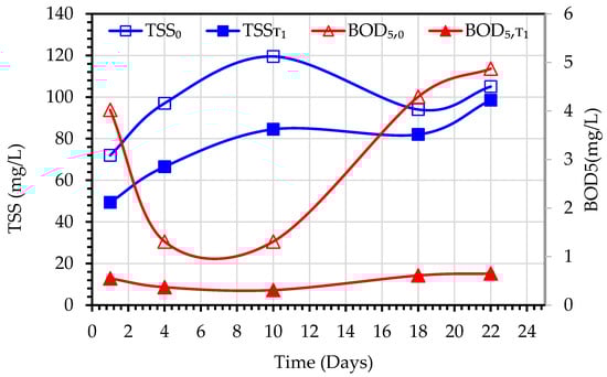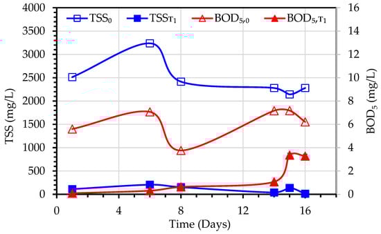 The values of TSS0 represent the mixed liquor suspended solids (MLSS) concentrations of the MBBMR tank, while TSST1 values refer to the effluents of the MBBMR tank. Similarly, the BOD5,0 is meant for the mixed liquor of the MBBMR tank, and BOD5,T1 refers to the effluents of the MBBMR tank. The variations of these parameters are depicted in Figure 7 (Experiment 1) and Figure 8 (Experiment 2). During the experiment period, the TSS0 increased from 72 to 119.5 mg/L and the TSST1 increased from 50 to 98.5 mg/L. The removal efficiency of MBBMR for TSS varied from around 45% at the beginning of the testing period to negative values at the end which indicated insufficient acclimatization of microorganisms in the tank. While under the normal and steady operation of MBBMR, it is expected to achieve stable TSST1 values and high TSS removal efficiency [26], the TSST1 values increased with the increase in TSS0 values. This indicates that the testing period of 3 weeks is not adequate to achieve the required biodegradation rate of biomass. Arabgol et al. [27] reported that five weeks of operation are required for full inoculation of MBBR, followed by another three weeks for reaching steady-state operation. In the case of BOD5, the removal efficiency varied from 89% to 95%.