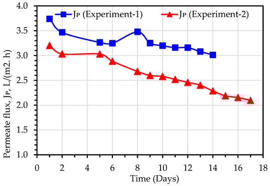 A comparison of permeate flux (Jp) obtained during Experiment 1 and Experiment 2 has been illustrated in Figure 9. The MD permeate flux was observed to reduce linearly, due to fouling of the membranes or pore blockage, and the TDS elevation in the MLSS liquor. The average values of permeate flux for Experiment 1 and Experiment 2 were 3.3 and 2.6 L/(m2h), respectively, while the average TSD of MLSS liquor for Experiment 1 and Experiment 2 were 1948 and 2291 mg/L, respectively (Table 3). Therefore, it can be calculated that the percentage reduction in Jp (21%) is almost correlated with the percentage increase in TDS (18%). Hence, it can be concluded that the TDS plays a crucial role in the MD permeate flux [24]. When TDS of the permeate water was increased from 1.9 mg/L in Experiment 1, when the TSD of MLSS liquor was 1948 mg/L, to 32 mg/L in Experiment 2, when the TDS of MLSS liquor was 2291 mg/L (Table 3). Membrane wetting is the only possible reason for the increase of permeate water TDS. Experiment 2 was carried out after Experiment 1 without changing the MD module, hence loss of membrane hydrophobicity, and subsequently, the occurrence of membrane wetting may be attributed to the number of days of use as well as the increase in MLSS liquor salinity [14,24].
