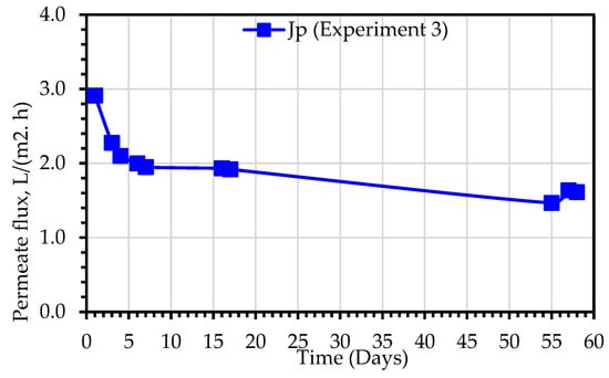 In experiment 3, a hydrophobic hollow fiber membrane module was submerged in the MDBR tank, where the shell side comes into direct contact with the hot MLSS liquor, while the cold permeate is recirculated in the lumen side of the MD module. The hydrodynamic regime in the outer boundary of the membranes is affected only by the movement of air bubbles, while the permeate water velocity inside the lumen is related to the permeate recirculation flow rate which was fixed at 2 L/min. As illustrated in Figure 10, the permeate flux, Jp, value varied in the range of 1.47–2.91 L/(m2.h). The experiment was carried out for a period of 60 days. The flux was observed to decrease in a more rapid rate in the first 7 days of the experiment, where the normalized flux declined from 1 to 0.69, then the rate of decrease remains moderate for the remainder of the experiment, where the normalized flux declined from 0.69 to 0.56. As explained earlier, the reduction in flux is due to the synergy effect of two factors i.e., the effect of membrane fouling and the effect of increased concentration of the MLSS liquor.
