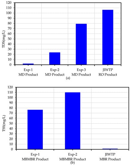 The TDS values for the RO effluent at the JICWTP and MD permeate for all three experiments are shown in Figure 12a. As expected, the average TDS value of the MD product for the Exp1 configuration in which secondary treated wastewater was used as a feed for the MBBMR step was less than 2 mg/L. However, the average TDS of the advanced RO treatment product was 106 mg/L. When primary wastewater was used as feed for the MBBMR step, the TDS of the MD product increased to around 24 mg/L probably due to the wetting of the MD membrane by surfactants and oil residues present in the primary feed water. Further, the TDS of the MD permeate was worsened in the case of the Experiment 3 configuration in which the MBBMR step was excluded. Further, The TSS values of UF effluent from the JICWTP are compared to the MBBMR setup in Experiment 1 and Experiment 2, as shown in Figure 12b. The comparison of the TSS data showed higher performance of the advanced RO treatment at JICWTP compared to the configurations tested in this work. The use of a sand filter prior to the UF step eliminates oil and nanoparticles present in the secondary wastewater by absorption mechanism, resulting in a TSS value of 1 mg/L. However, in the case of Experiment 1 and Experiment 2 configurations, the MBBMR treatment is not efficient for the removal of these contaminants. Therefore, the TSS values of 76 mg/L and 110 mg/L were found.