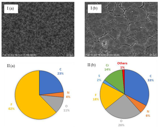 Images of SEM (I) (magn. ×1000) and elemental composition of analysis EDS (II) of the surface JX membrane before (a) and after (b) microfiltration of the liquid fraction created as a result of the thermal pressure hydrolysis of chromium waste from tanneries.