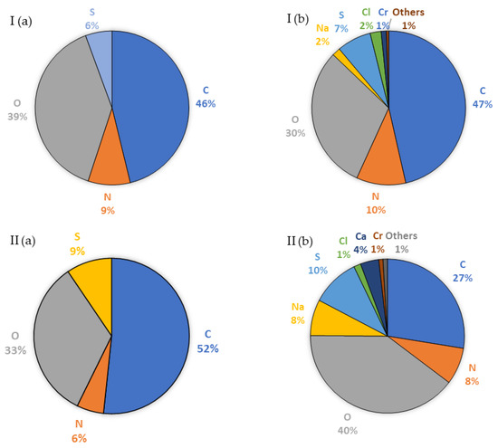 Elemental composition (%) of the surface of (I) TS40 and (II) DL membranes before (a) and after (b) nanofiltration of the liquid fraction created as a result of the thermal pressure hydrolysis of chromium waste from tanneries, pre-treated using microfiltration, determined using EDS.
