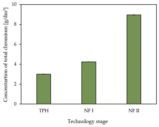 Total chromium concentration after individual stages of the proposed tannery waste valorisation technology. TPH—thermal pressure hydrolysis; NF I—nanofiltration (stage I); NF II—nanofiltration (stage II).
