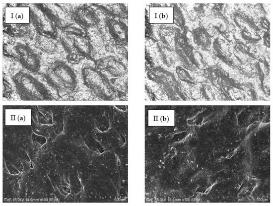 Images of the surface of bovine hides tanned using (a) a commercial tanning agent and (b) chromium recovered from tannery waste (concentrate), taken using the (I) 3D microscope (magnification: ×500) and (II) SEM (magnification: ×100).