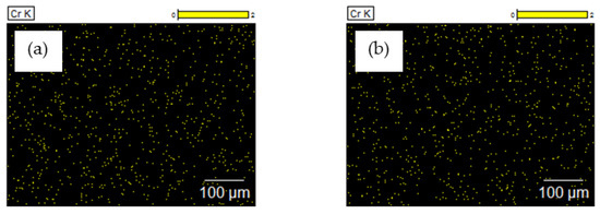 Maps of chromium distribution on the surface of the bovine hides tanned using (a) a commercial tanning agent and (b) chromium recovered from tannery waste (concentrate), taken using EDS.