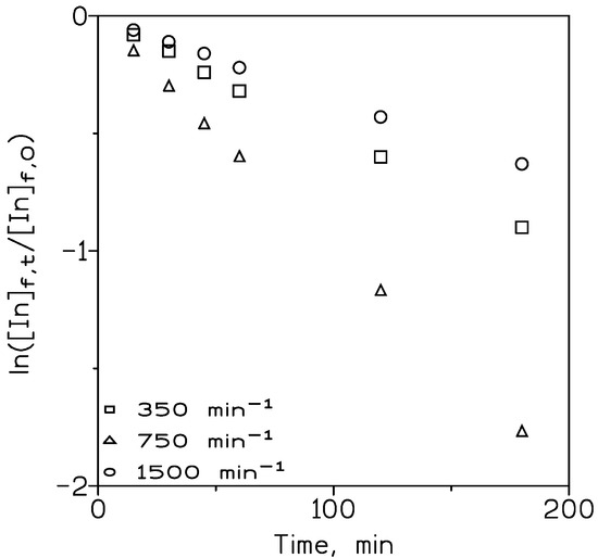 Plot of ln([In]f,t/[In]f,0) versus time at various stirring speeds. Feed phase: 0.01 g/L In(III) in 1 M HCl. Organic phase: 10% v/v TOAH+Cl− in Solvesso 100 immobilized in GVHP support. Receiving phase: 0.1 M HCl.