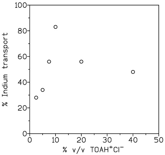 The results obtained showed that increasing the carrier concentration from 2.5% v/v to 10% v/v, in the membrane phase increased the percentage of indium transport; however, from 10% v/v, this percentage decreased. This is probably attributable to the increase in viscosity of the organic phase, and as a consequence, an increase in the membrane resistance to indium transport [25,26,27].