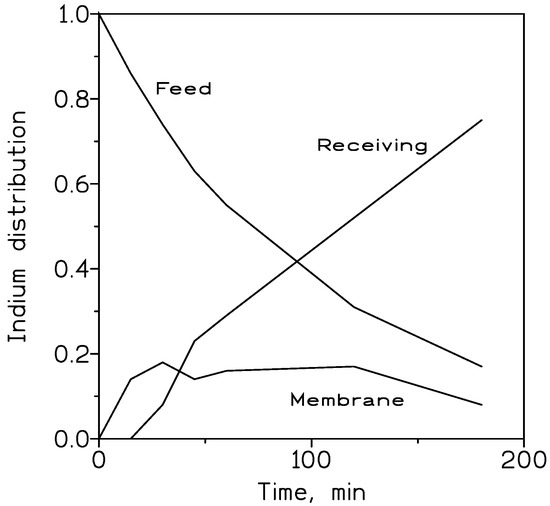 Figure 4 shows, in the particular case using 10% v/v TOAH+Cl− as carrier phase, the distribution of indium between the feed, membrane and receiving phases at various elapsed times. It can be seen that indium is basically not retained in the membrane phase, being in almost continuous indium flux from the feed to the receiving phase.