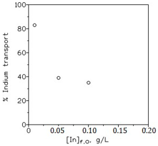 Figure 5 shows the variation in the percentage of indium transport versus the initial concentration of indium, ranging from 0.01 to 0.1 g/L in the feed phase side. It can be observed that within the present experimental conditions, the percentage of metal transport decreased with the increase in the initial indium concentration in the feed phase. This behaviour is attributable to the grown population effect due to the increase in the metal concentration in the solution [28]. Additionally, the increase in the indium concentration in the feed phase resulted in the saturation of the membrane and thus, to a lower effective membrane area and to the retention of the metal-ionic liquid species on the entry side of the feed–membrane sites. Together, they caused a decrease in indium transport.