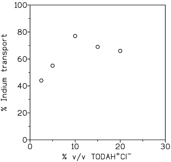 Figure 6 represents the results obtained in this investigation about the effect of TODAH+Cl− concentration on indium transport. The feed phase contained 0.01 g/L In(III) and 7 M HCl, whereas the corresponding organic phases were of 2.5–20% v/v ionic liquid in Solvesso 100.