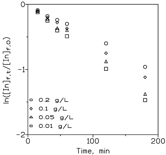 Variation of ln([In]f,t/[In]f,0) versus time for different initial indium concentrations in the feed phase. Feed phase: Indium in 7 M HCl. Organic phase: 10% v/v TODAH+Cl− in Solvesso 100 immobilized on GVHP support. Receiving phase: 0.1 M HCl. Temperature: 20 °C.