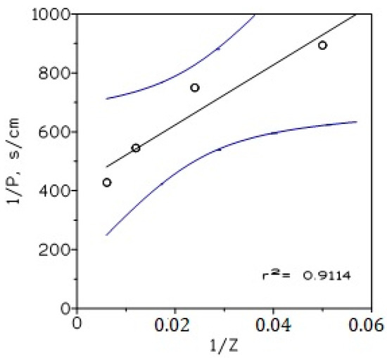 Plot of 1/P versus 1/Z (Equation (16)). Feed phase: 0.01 g/L In(III) in 7 M HCl. Organic phase: 1.25–10% v/v TODAH+Cl− in Solvesso 100 immobilized on GVHP support. Receiving phase: 0.1 M HCl. Temperature: 20 °C. Dotted line showed 95% confidence interval of the regression line.