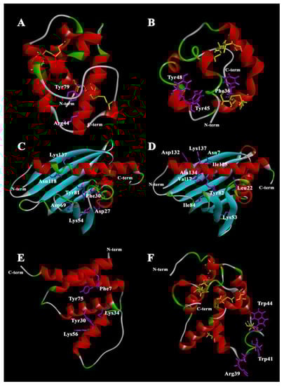 A number of amino acid residues located inside and at the entrance to the hydrophobic cavity play a key role in protein–lipid interactions [5]. In most LTP1 proteins, Arg44 (numeration according to LTP1 from Oryza sativa rice (PDB ID 1RZL)) residue is located near the entrance; this arginine interacts with polar head groups of lipids [16]. In LTP1 of rice, another basic residue, Lys35, is also involved in the interaction. For some LTP1s, Tyr79 residue can form hydrogen bonds with the polar head group of lipid ligands [17,18]. In the case of LTP2, the side chains of Phe36, Tyr45, Tyr48, and Tyr80 (numeration according to rice LTP2 (PDB ID 1L6H)) are the key ones in ligand binding [13].